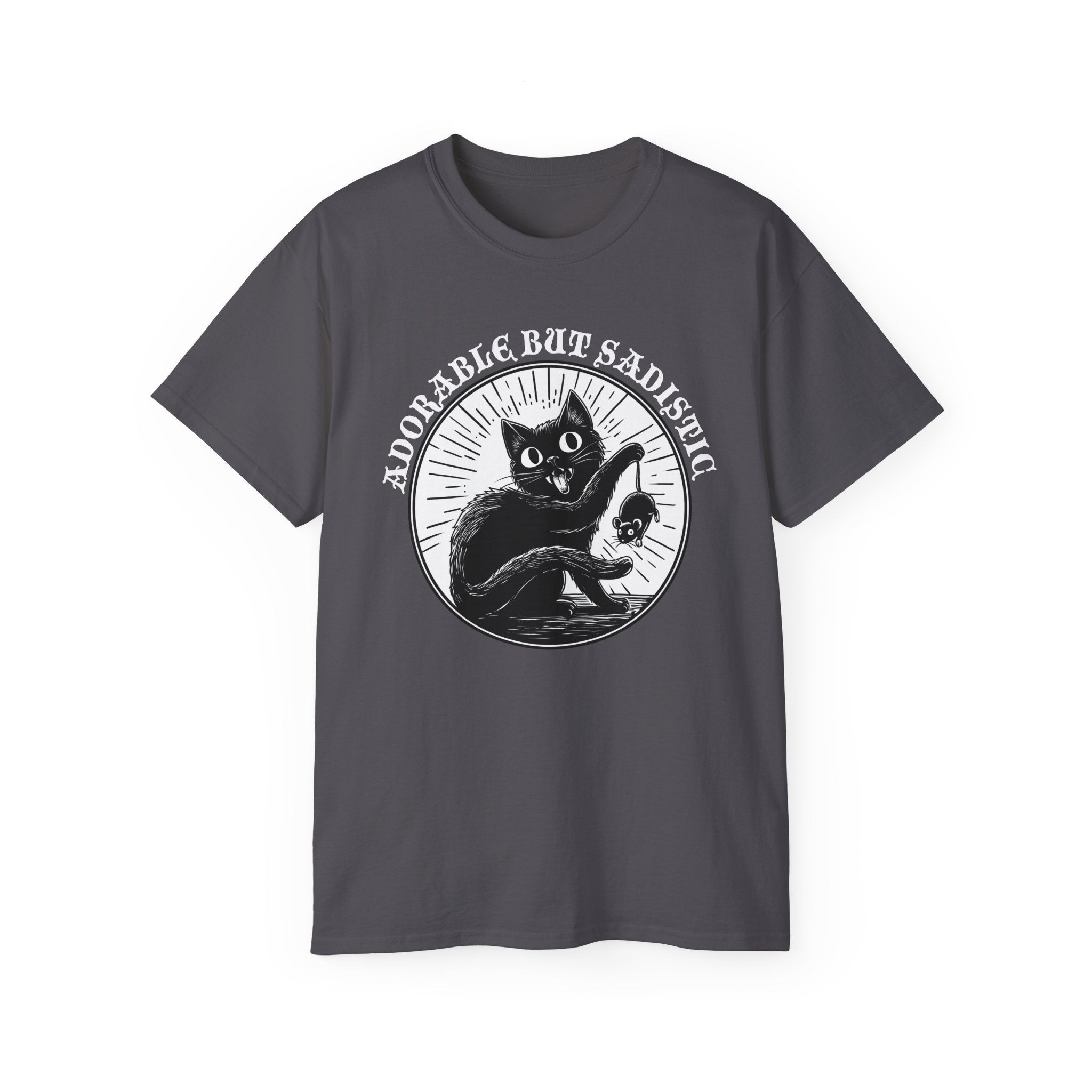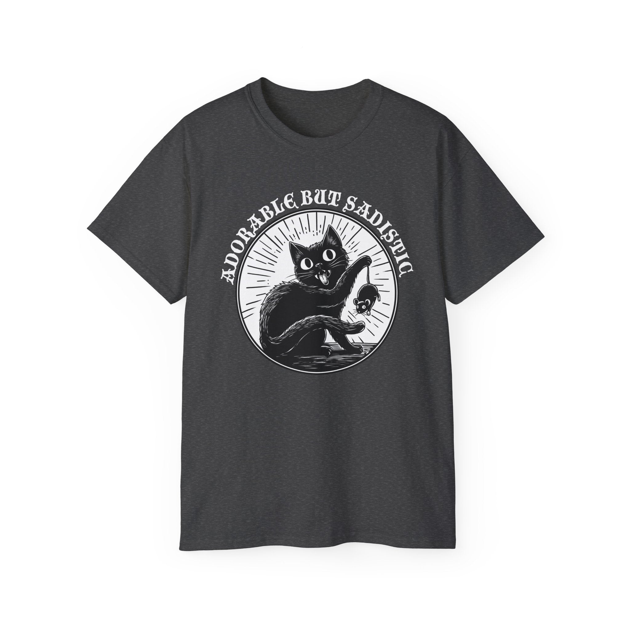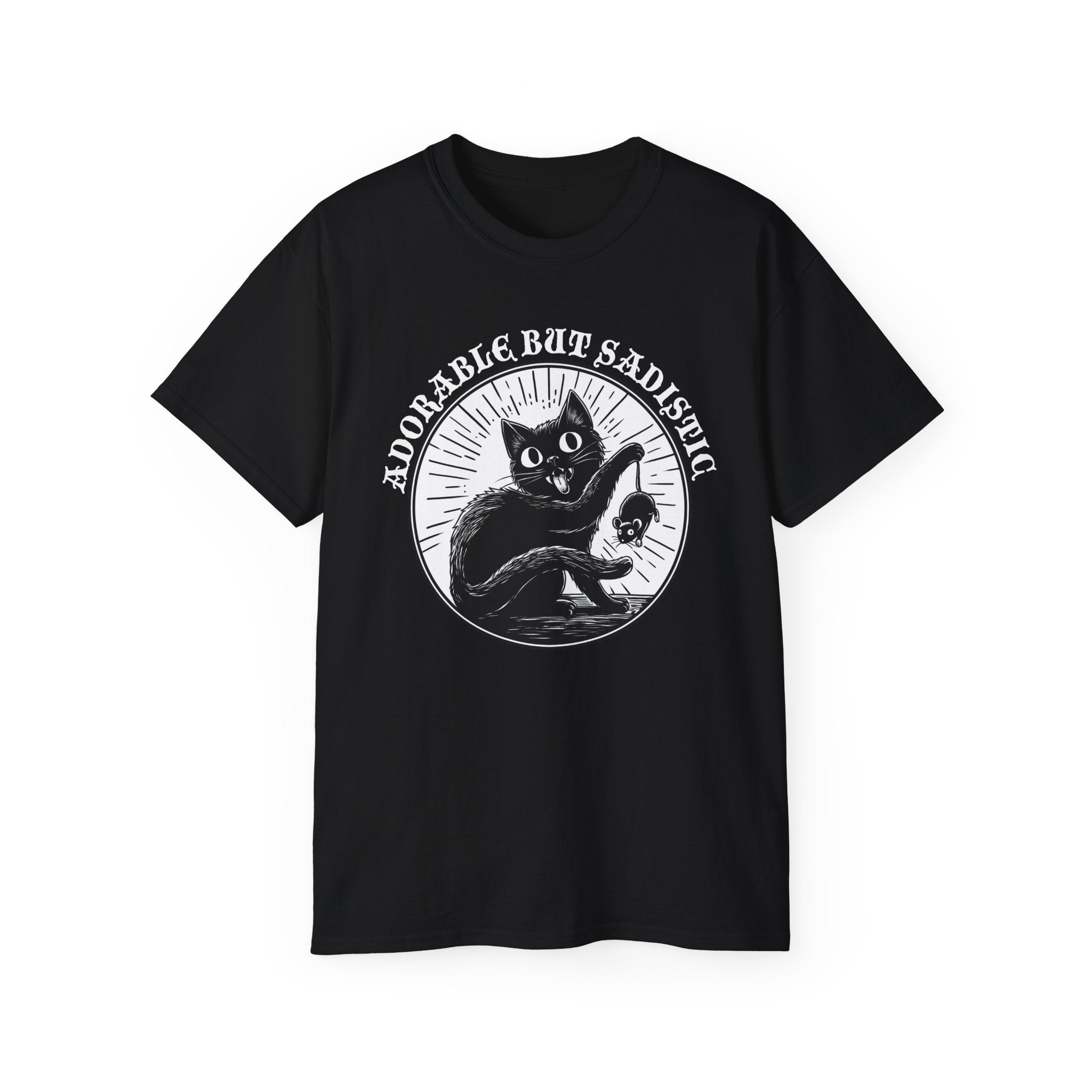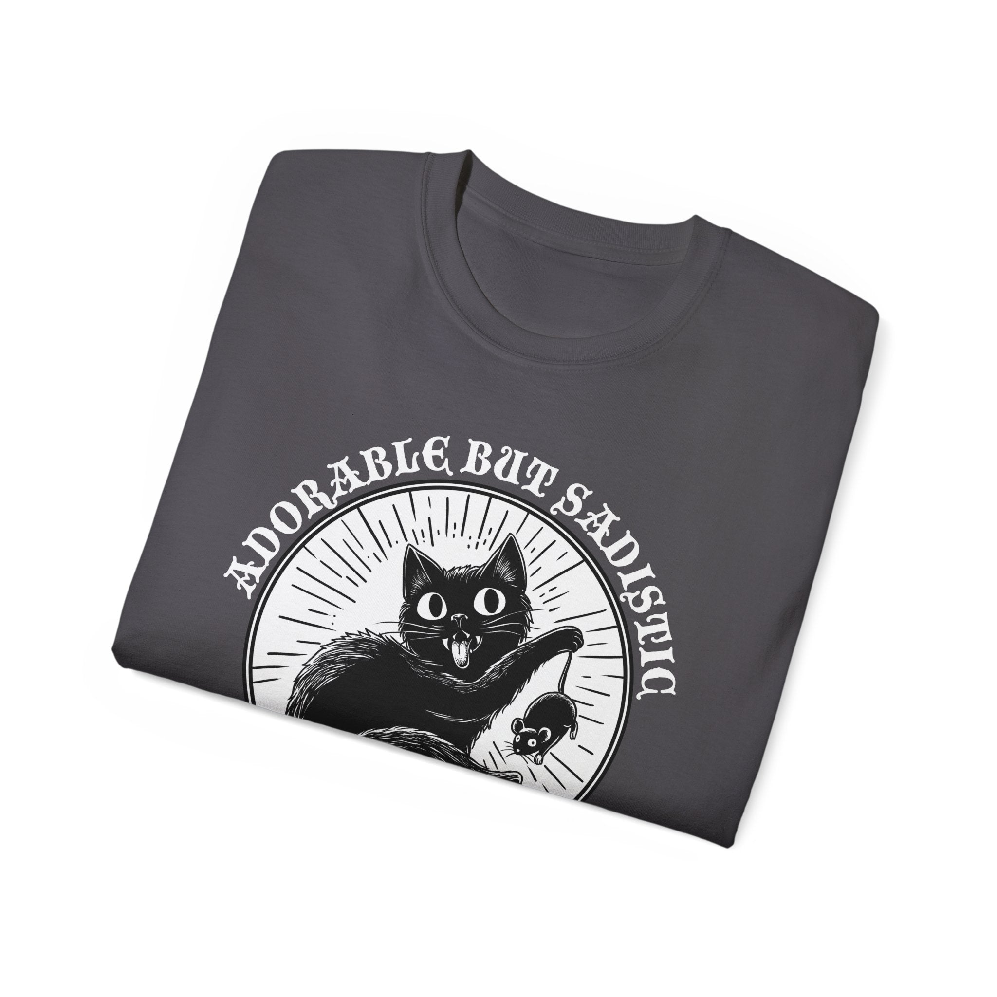 This t-shirt is the purrfect choice for cat lovers with a dark sense of humor. It captures the unpredictable nature of felines, from being adorable one moment to torturing a bug or rodent the next. Made with 100% combed, ring-spun ultra-cotton, it offers comfort and style for all seasons. It's an awesome gift idea for adult cat enthusiasts looking for a playful addition to their wardrobe.