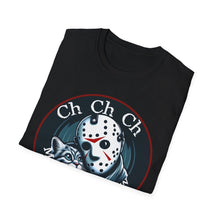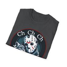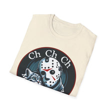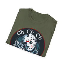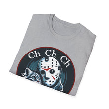 This horror-themed T-Shirt combines the Crystal Lake killer with an adorable feline, perfect for cat lovers and horror movie enthusiasts. It's a funny mashup that's sure to turn heads. Great for horror con events and parties.